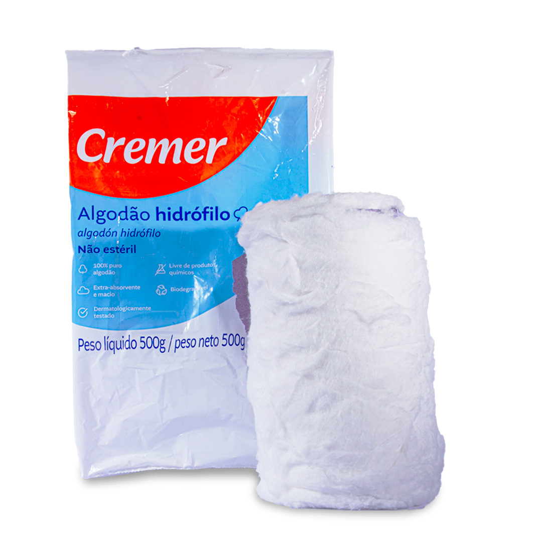 Algodão Hidrófilo Cremer em formato de rolo, com peso líquido de 500g, ideal para uso diário.